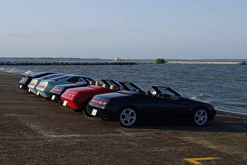 茨城のイタ車乗りの人たちがツーリングをしているというので、合流して霞ヶ浦まで走ることに。みんなの車を並べて記念撮影